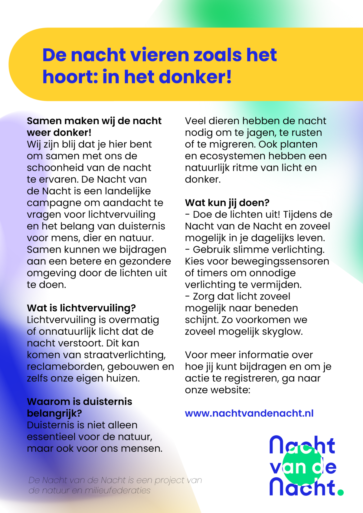 We nodigen iedereen (individu en organisatie) uit om mee te doen en te delen in de Nacht van de Nacht campagne. Op deze pagina vind je een mooie verzameling met communicatieproducten welke je mag gebruiken om in het kader van de Nacht van de Nacht in te zetten. Ben je op zoek naar iets specifieks? Dan denken we graag met je mee. Neem in dat geval contact op met j.holwerda@milieufederatie.nl